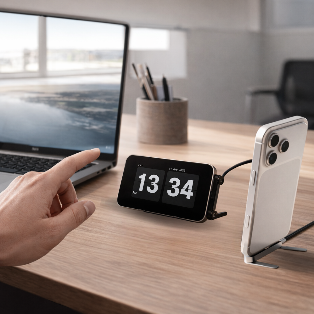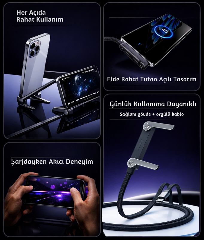 Dahili stand ve açılı uç yapısı sayesinde, farklı kullanım senaryolarında ekstra aparata ihtiyaç duymazsın.